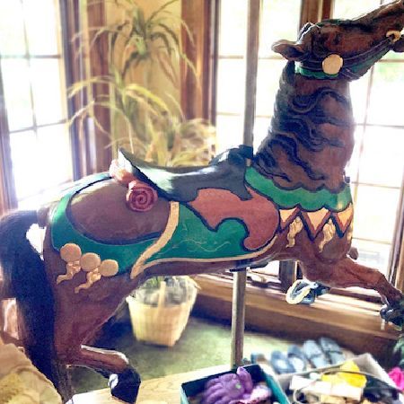 Circa 1912-1915 wooden carousel horse from the workshop of Charles Carmel, Brooklyn, NY. The second row jumper carries its stargazing head on an erect neck furnished with a mane of deeply carved sinuous tendrils and an unusually long forelock. A simple saddle with flap and bedroll rests on a fringe bordered blanket having an incised freehand design. Tassels depend from a double layered peytral of scallops and triangles; the breeching sports tasseled roundels and the head is restrained by a bridle of complementary design. The figure, in excellent condition, measures 54 inches long and comes with stand and brass.