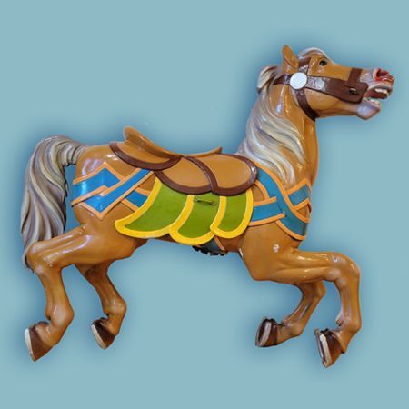 Late 1920s Philadelphia Toboggan Company carousel horse deaccessioned from the John & Mable Ringling Museum of Art. The all wood figure is a lively jumper, the glass-eyed head raised to level on an upright neck furnished with a windblown mane. Art Deco style trappings feature an unusual saddle having three flaps resting on a blanket of three curved lobes secured by interlaced breast and shoulder straps while complementary breeching harnesses the hindquarters. 48 inches long x 48 inches high, very condition.