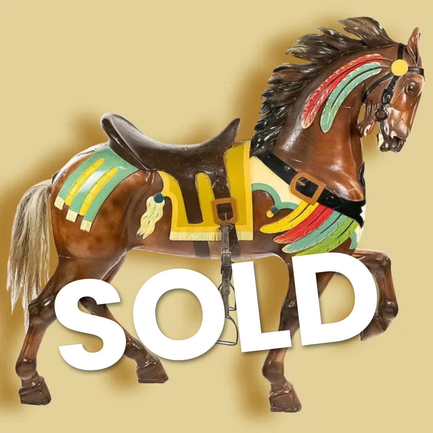 Early 1900s outside row stander from Westview Park, West View, PA Characteristic of S&C horses this spirited steed strides forth in a dramatic pose, mare flying, teeth bared and straining at the bit. S&G classic trappings include large buckles, feathers and breast shield. Excellent structural condition, nicely done time-worn park paint. 50 long x 60 high