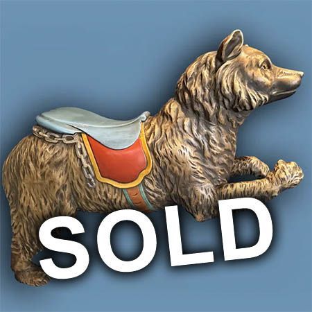 A very rare Dentzel Honey Bear. Parted out from the Idora Park, Youngstown, Ohio carousel, later in the Abby Aldrich Folk Museum in Colonial Williamsburg, VA. The leaping figure has a charming face with glass eyes and detailed fur carving. Older restoration by Nina Fraley. Excellent condition with minor cracks on the hind legs. 53 long x 45 high.